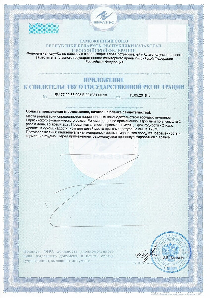 Registered as dietary supplement: Yes, document of conformity RU.77.99.88.003.Е.001981.05.18 dated 15.05.2018