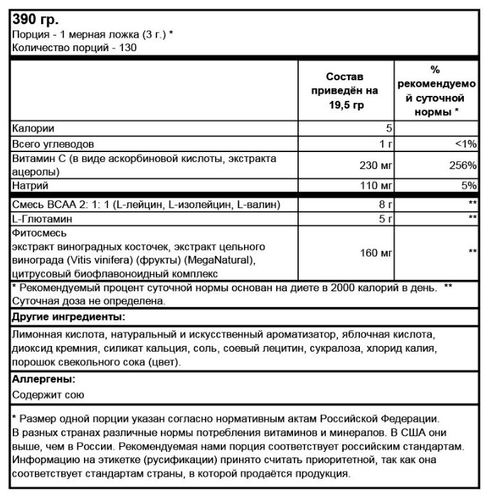 Type: BCAA, form: powder, main ingredient: valine, isoleucine, leucine, dietary features: no aspartame, no gluten, no lactose, no maltodextrin