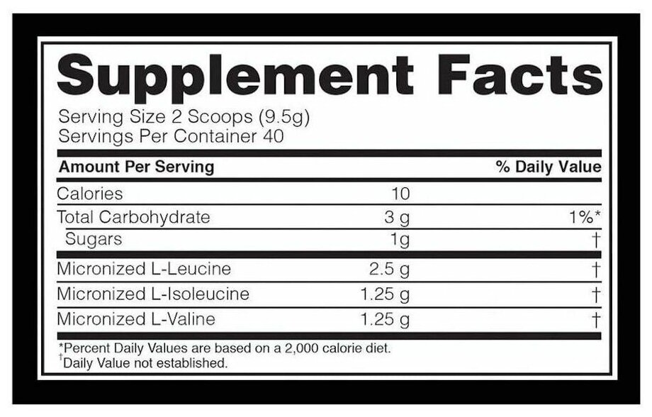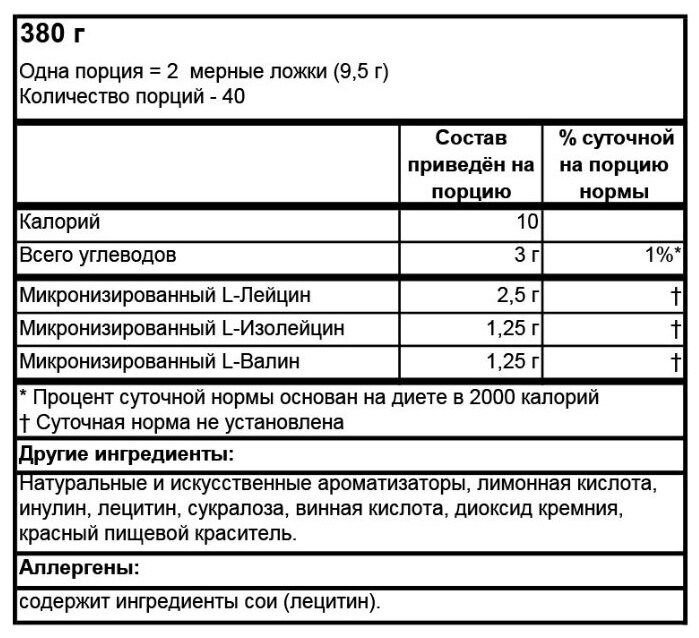 Type: BCAA, form: powder, main ingredient: valine, isoleucine, leucine, dietary features: aspartame-free, gluten-free, lactose-free