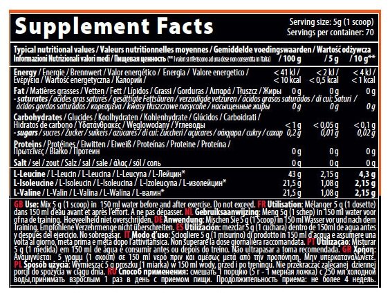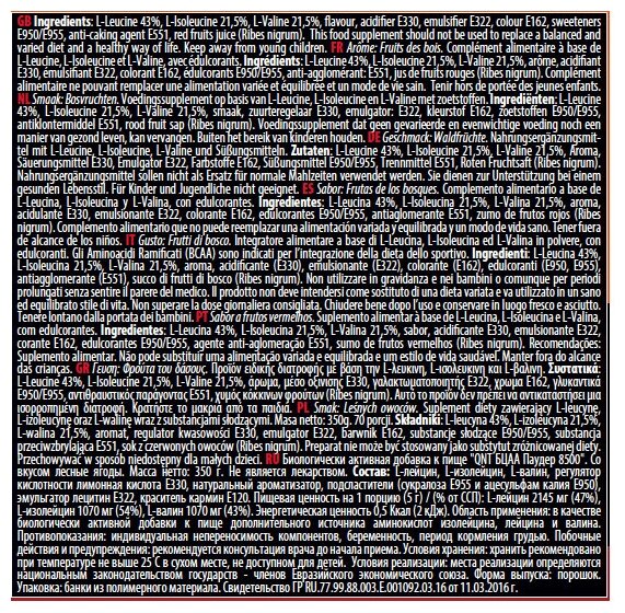 Type: BCAA, form: powder, main ingredient: valine, isoleucine, leucine, dietary features: no aspartame, no gluten, no lactose, no maltodextrin, no sucralose