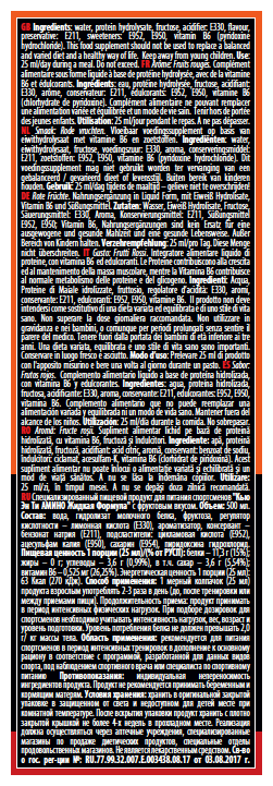 Type: amino acid, amino acid complex, release form: solution, main ingredient: alanine, arginine, aspartic acid, valine, histidine, glycine, glutamic acid, isoleucine, carnitine, leucine, lysine, methionine