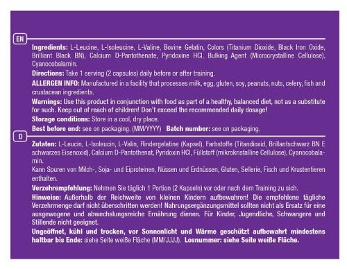 Type: BCAA, Form: Capsule/Tablet, Primary Ingredient: Valine, Isoleucine, Leucine, Diet: No Aspartame, No Maltodextrin, No Sucralose
