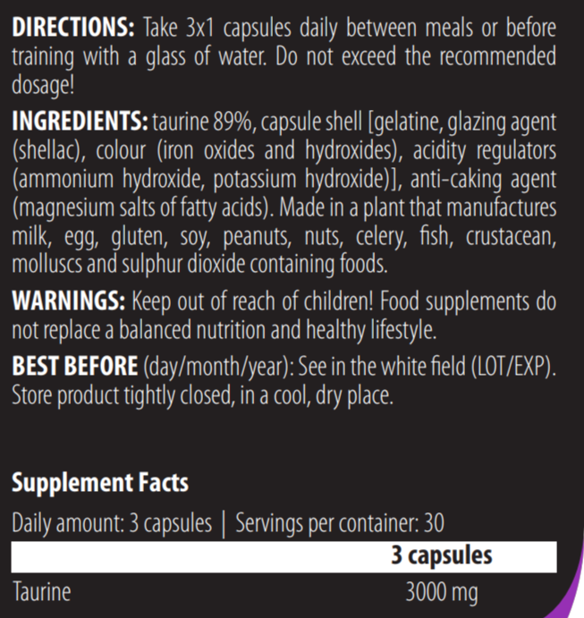 Type: amino acid, amino acid complex, amino acid complex, formulation: capsules/tablets, main ingredient: taurine