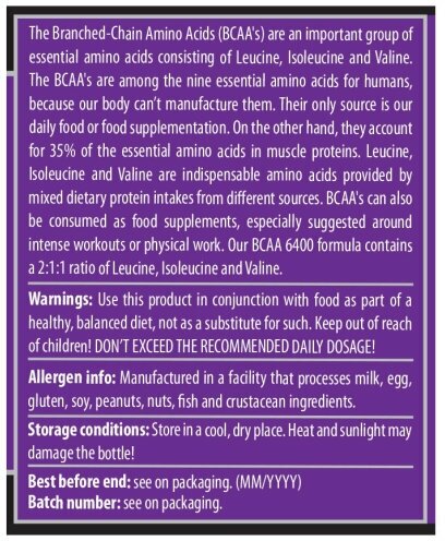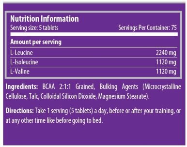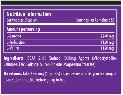 Type: BCAA, form of release: capsules/tablets, main ingredient: valine, isoleucine, leucine