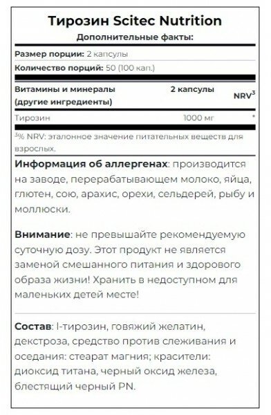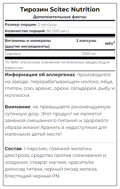Type: amino acid, dosage form: capsules/tablets, main ingredient: tyrosine, dietary features: no aspartame, no maltodextrin, no sucralose