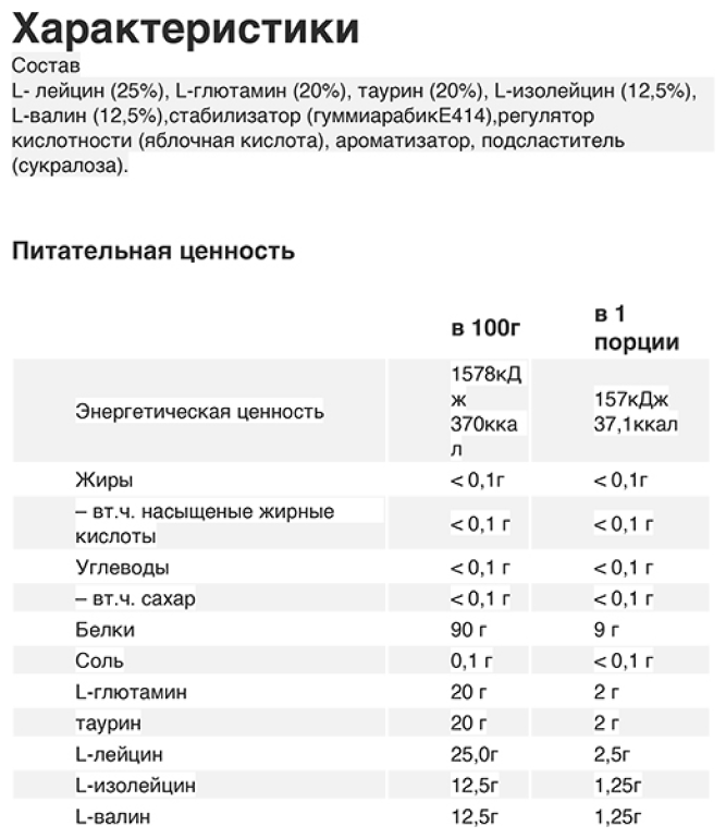 Type: BCAA, form: powder, main ingredient: L-valine, L-isoleucine, L-leucine, glutamine, taurine, dietary features: no aspartame, no maltodextrin