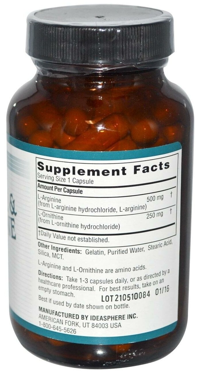 Type: amino acid, amino acid complex, formulation: capsules/tablets, main ingredient: arginine, ornithine, dietary features: aspartame free, gluten free, maltodextrin free, sucralose free