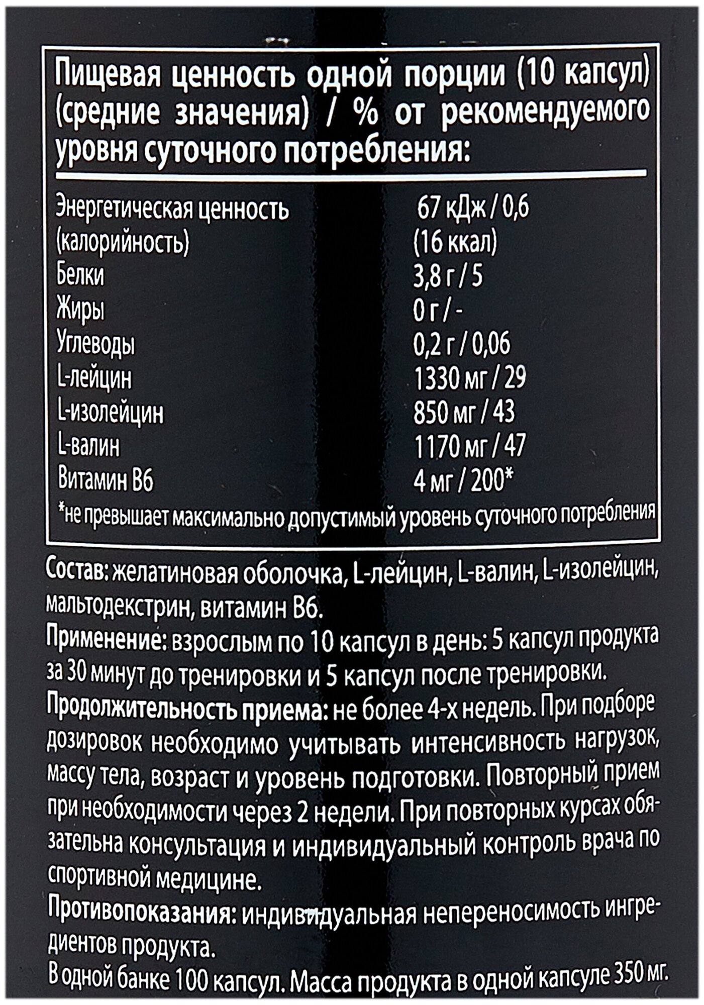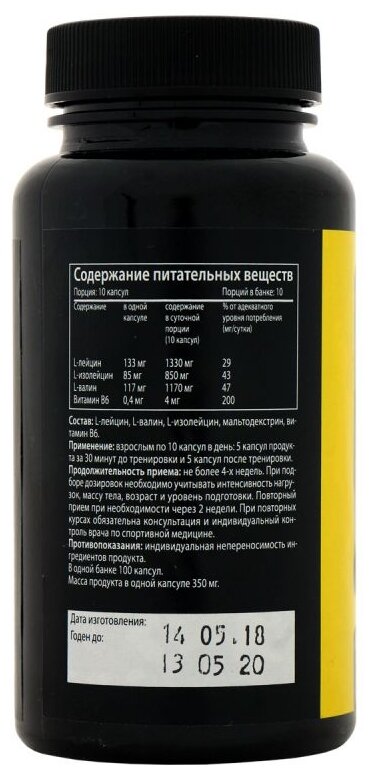 Type: BCAA, amino acid, formulation: capsules/tablets, main ingredient: valine, isoleucine, leucine