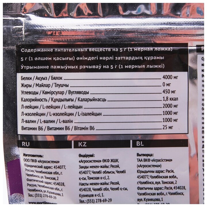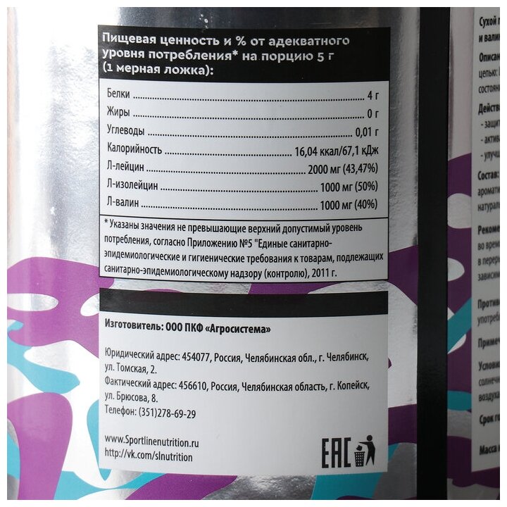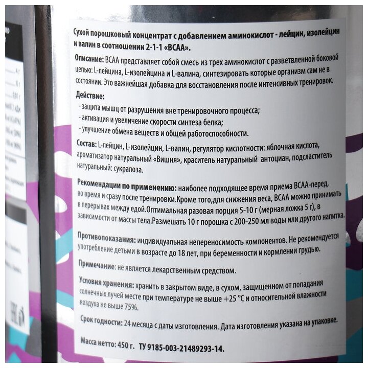 Type: BCAA, amino acid, amino acid complex, formulation: powder, main ingredient: valine, isoleucine, leucine