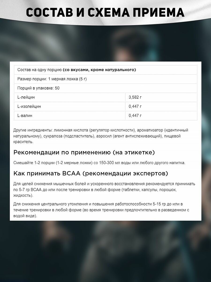 Type: BCAA, form: powder, main ingredient: valine, isoleucine, leucine, dietary features: no aspartame, no maltodextrin