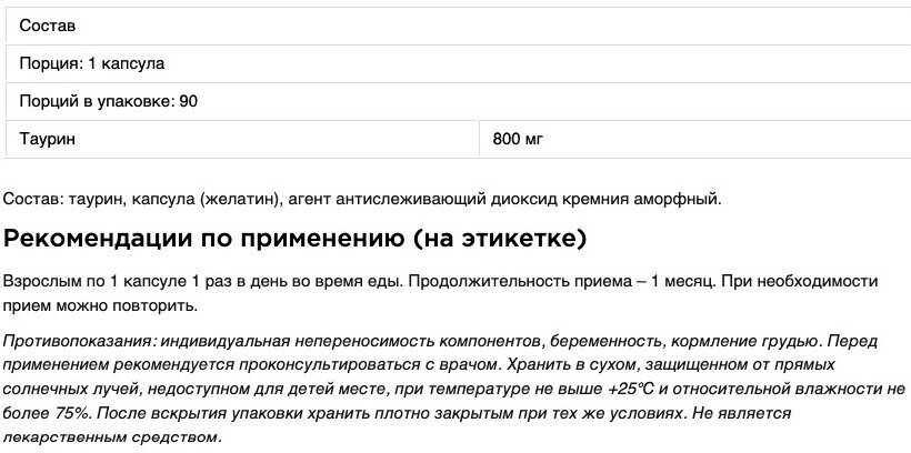 Type: amino acid, dosage form: capsules/tablets, main ingredient: taurine, dietary features: no aspartame, no maltodextrin, no sucralose