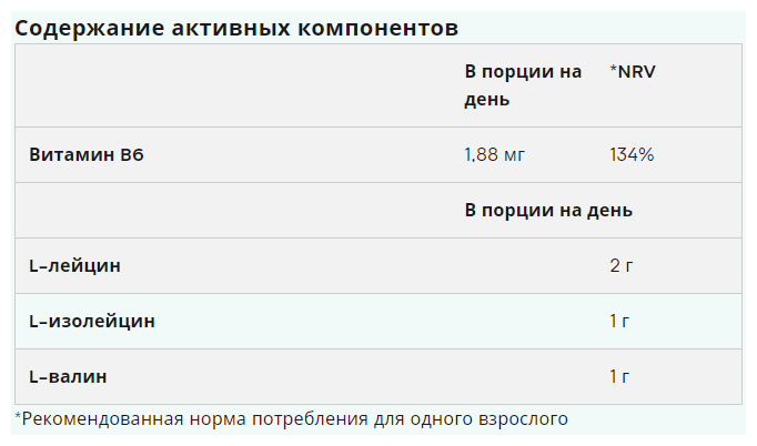 Type: BCAA, form: powder, main ingredient: valine, isoleucine, leucine, dietary features: no aspartame, no gluten, no lactose, no maltodextrin
