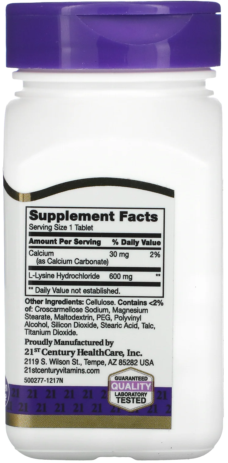 Type: amino acid, dosage form: capsules/tablets, main ingredient: lysine, dietary features: no aspartame, no gluten
