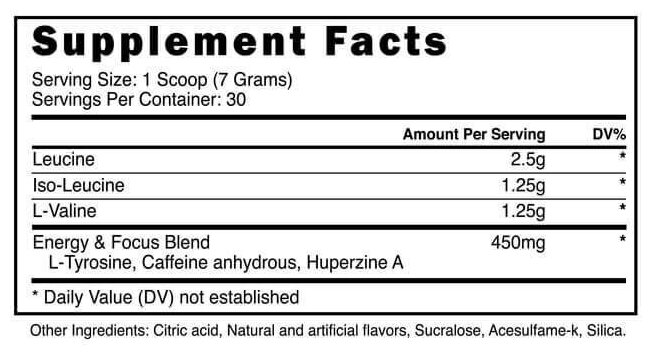 Type: BCAA, form: powder, main ingredient: valine, isoleucine, leucine, dietary features: no aspartame, no maltodextrin