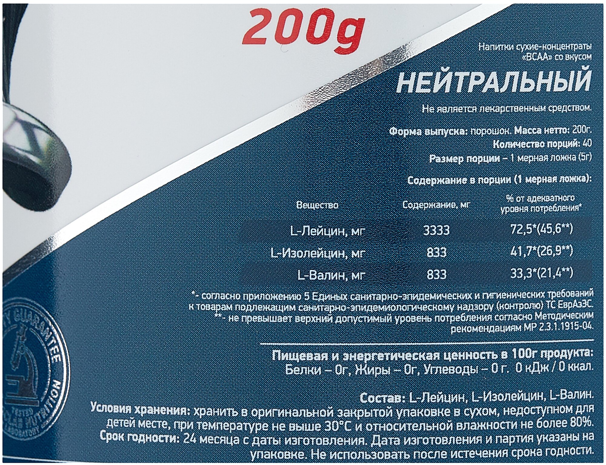 Type: BCAA, form: powder, main ingredient: valine, isoleucine, leucine, dietary features: no aspartame, no gluten, no lactose, no maltodextrin, no sucralose