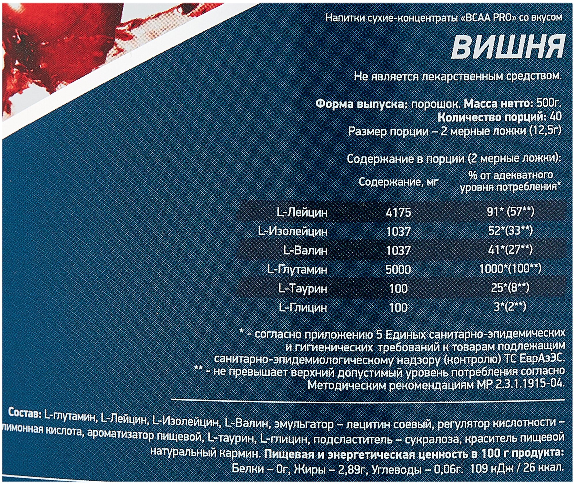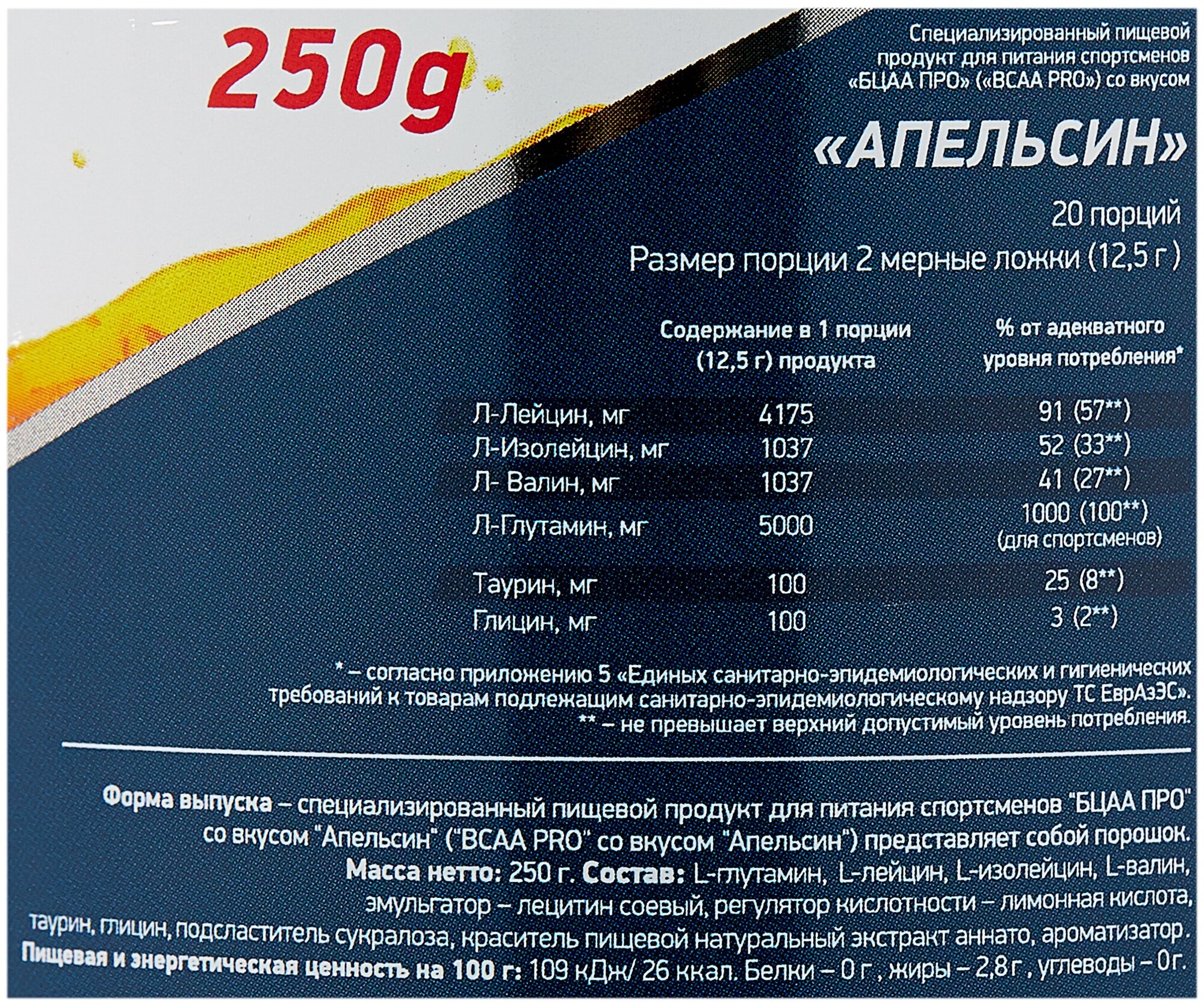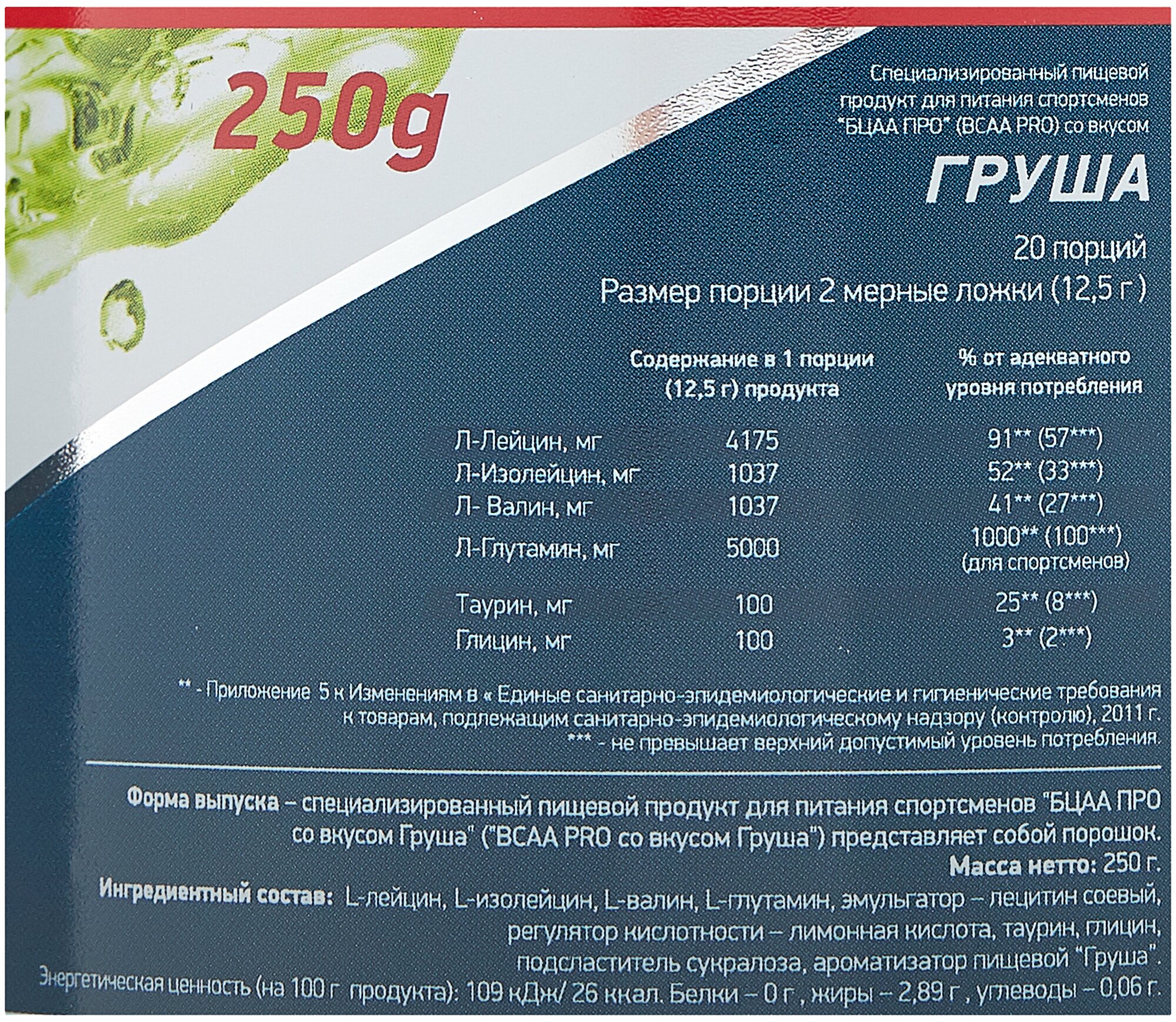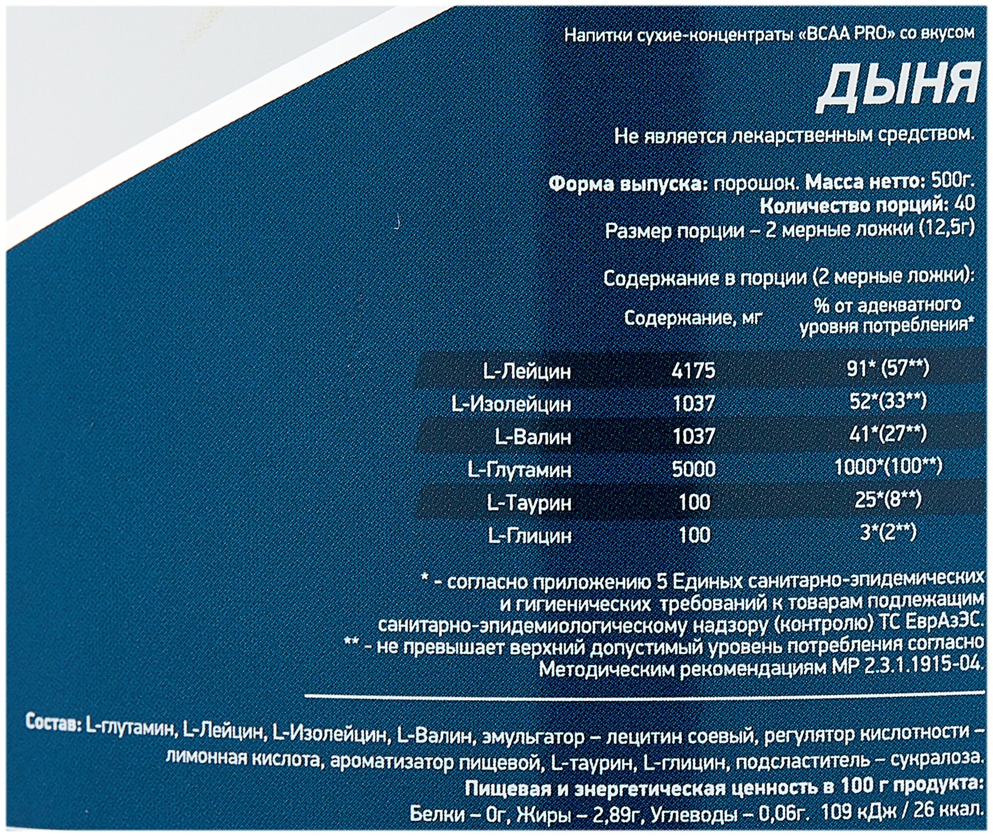 20 servings; bcaa ratio 4:1:1, l-leucine - 4175 mg per serving, l-isoleucine - 1038 mg per serving, l-valine - 1038 mg per serving; l-glutamine - 5000 mg per serving; serving size in gml: 12.5; purpose: provide you with energy, improve metabolism,