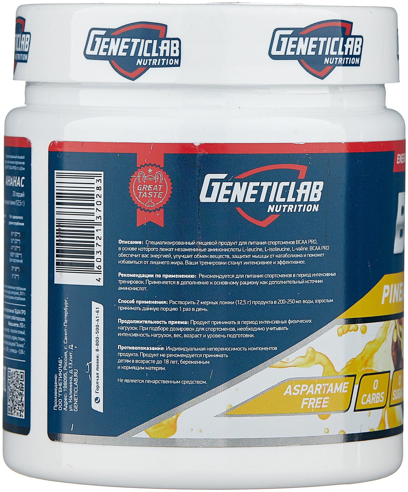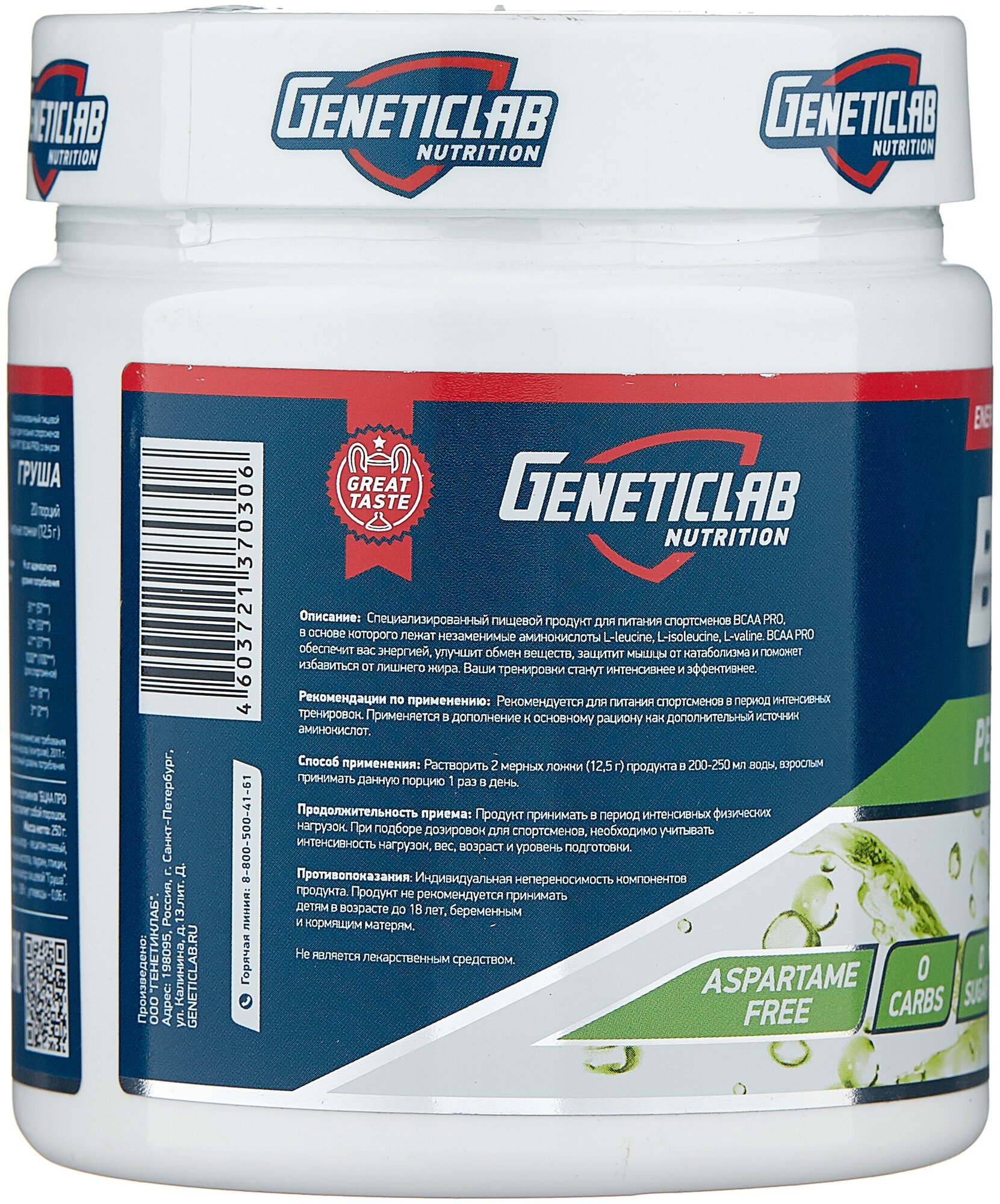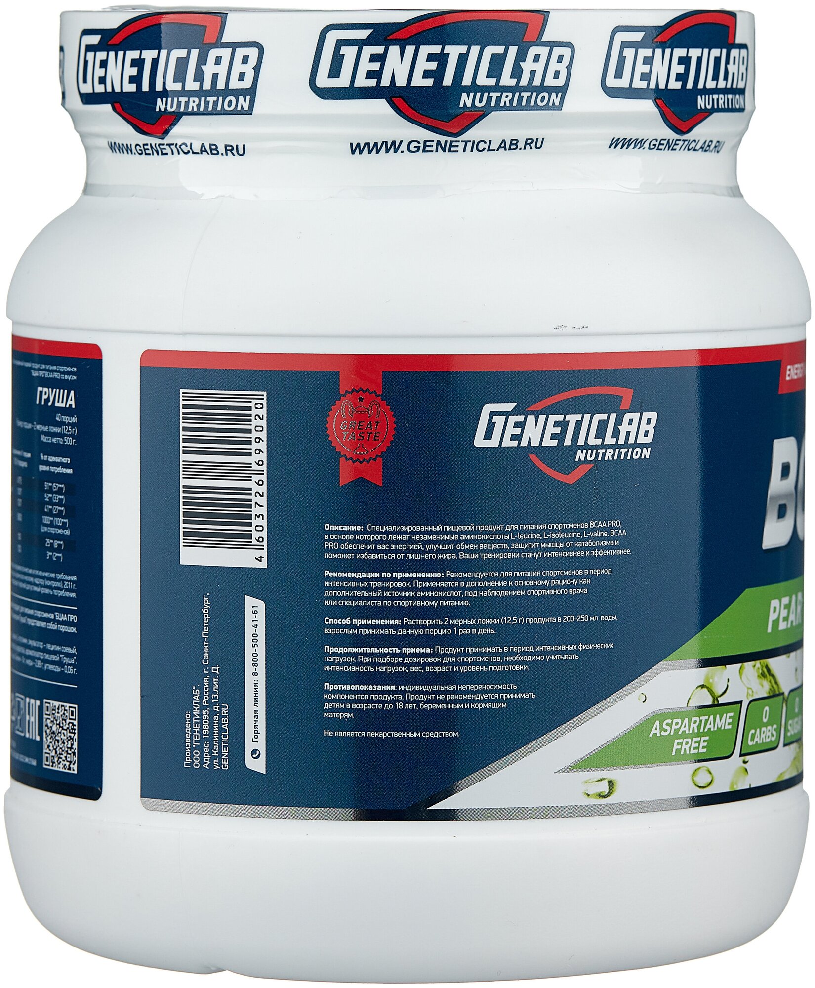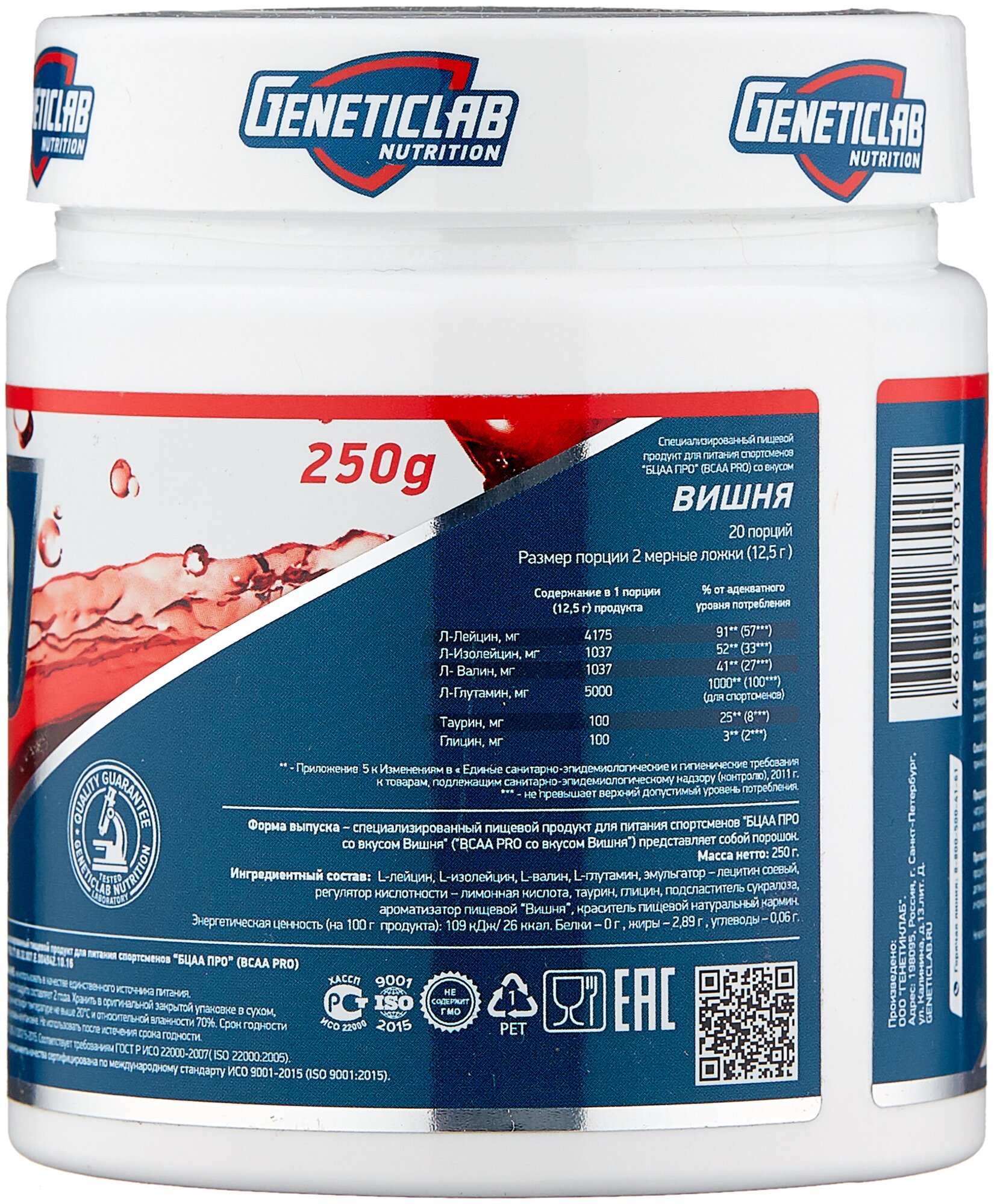 20 servings; bcaa ratio 4:1:1, l-leucine - 4175 mg per serving, l-isoleucine - 1038 mg per serving, l-valine - 1038 mg per serving; l-glutamine - 5000 mg per serving; serving size in gml: 12.5; purpose: provide you with energy, improve metabolism,