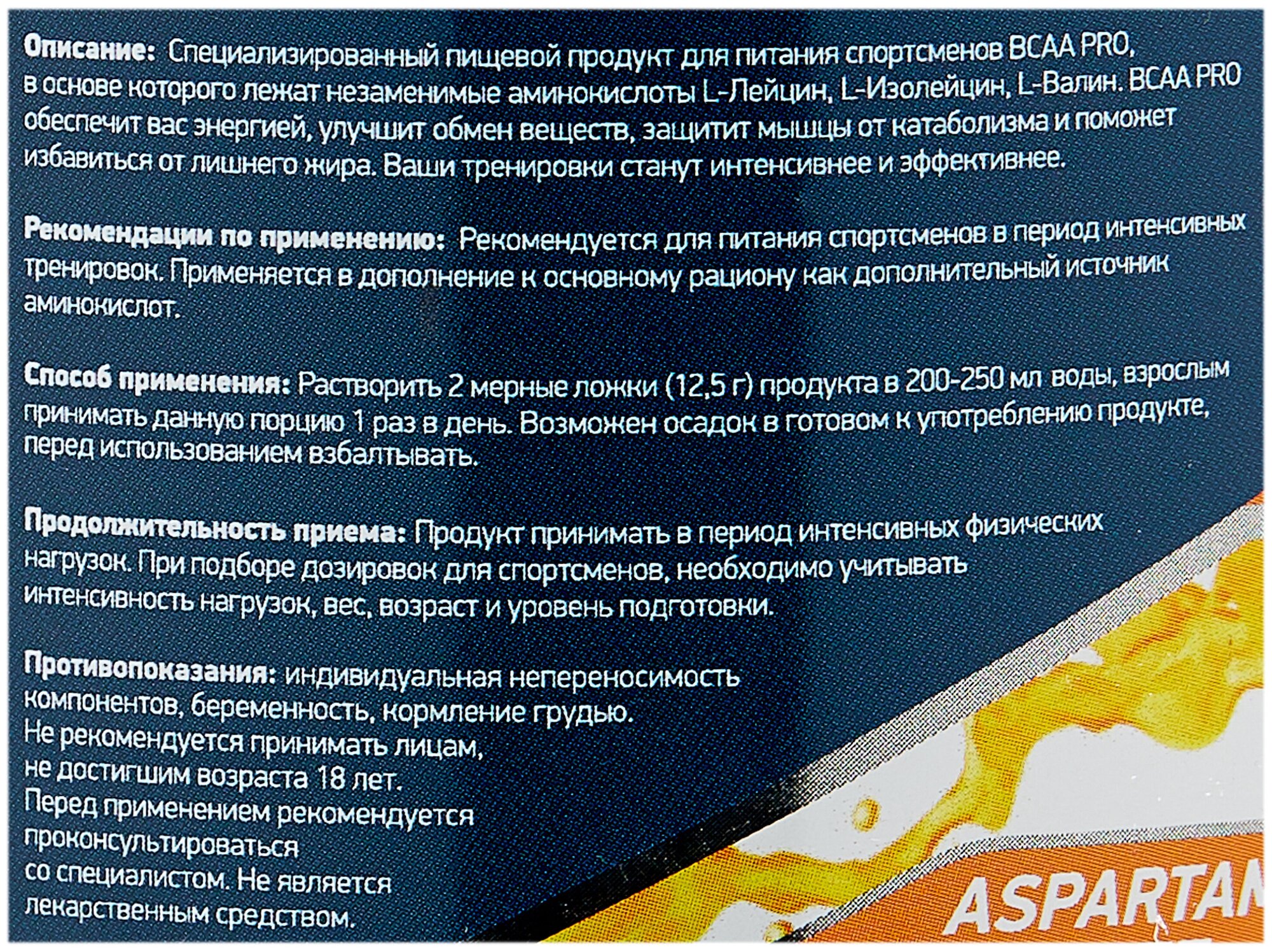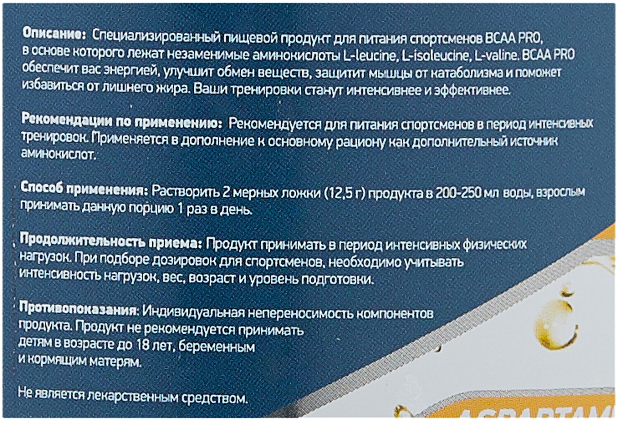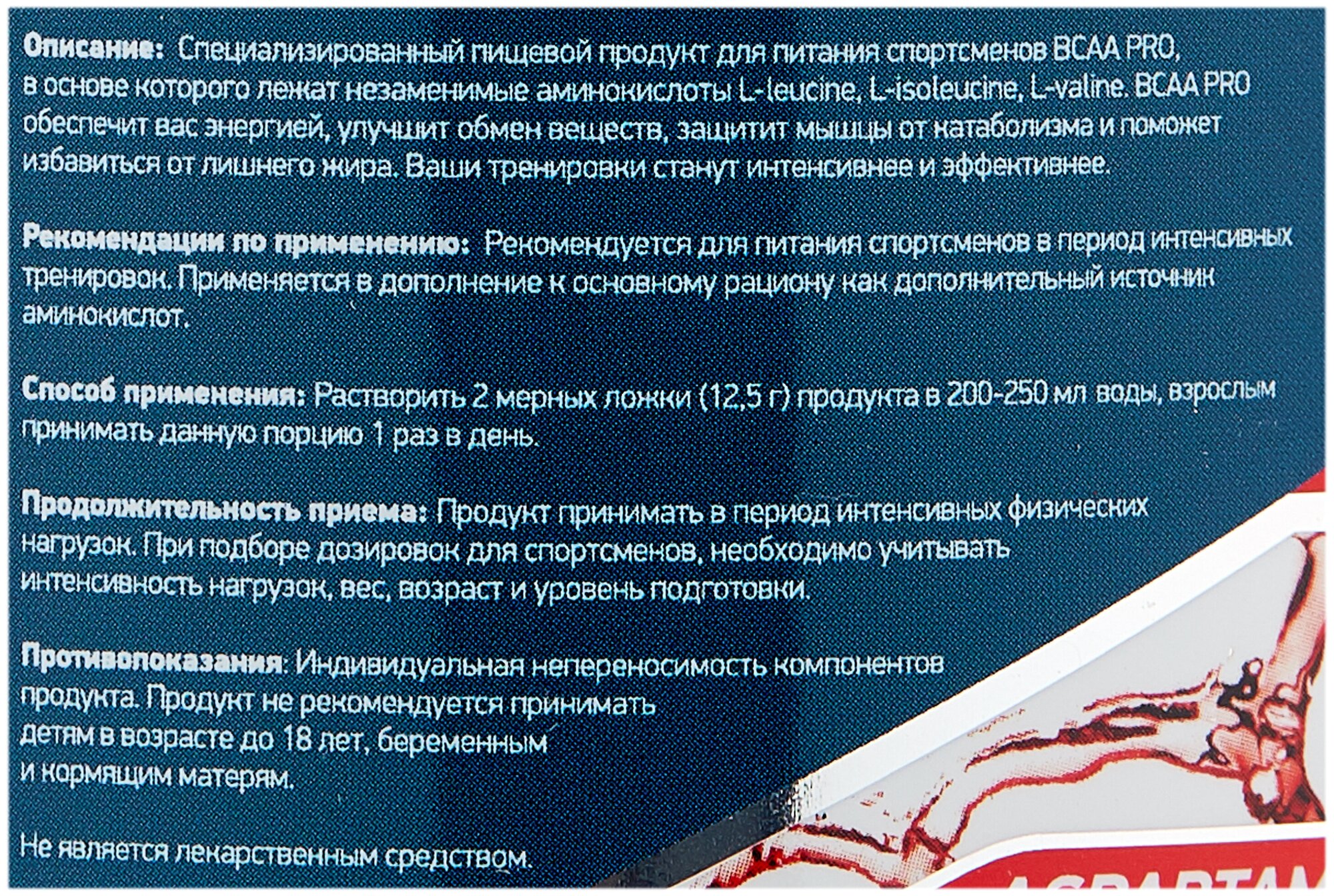 BCAA, amino acid complex: valine, glycine, glutamine, isoleucine, leucine, taurine