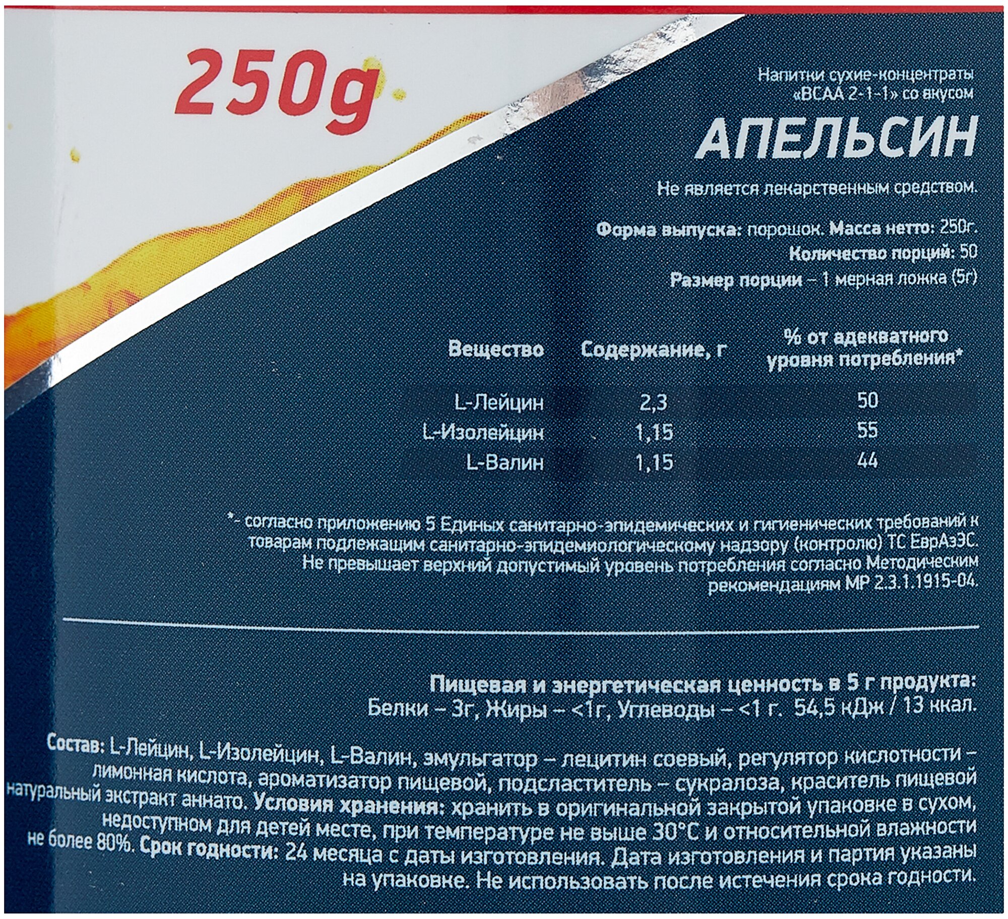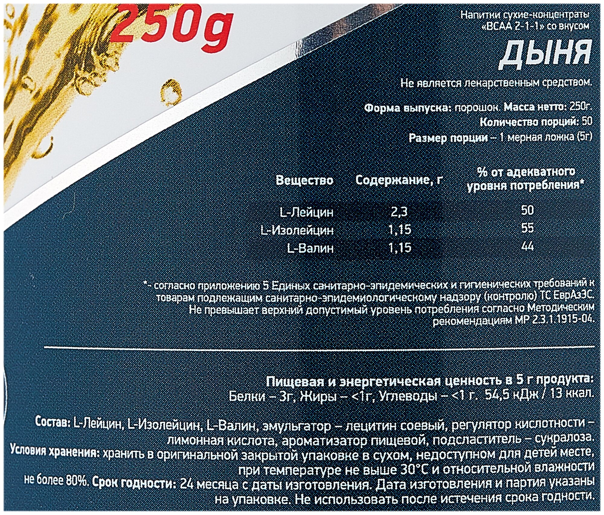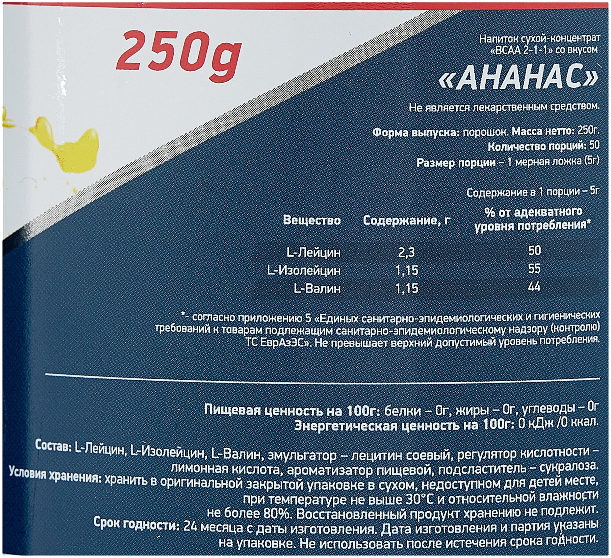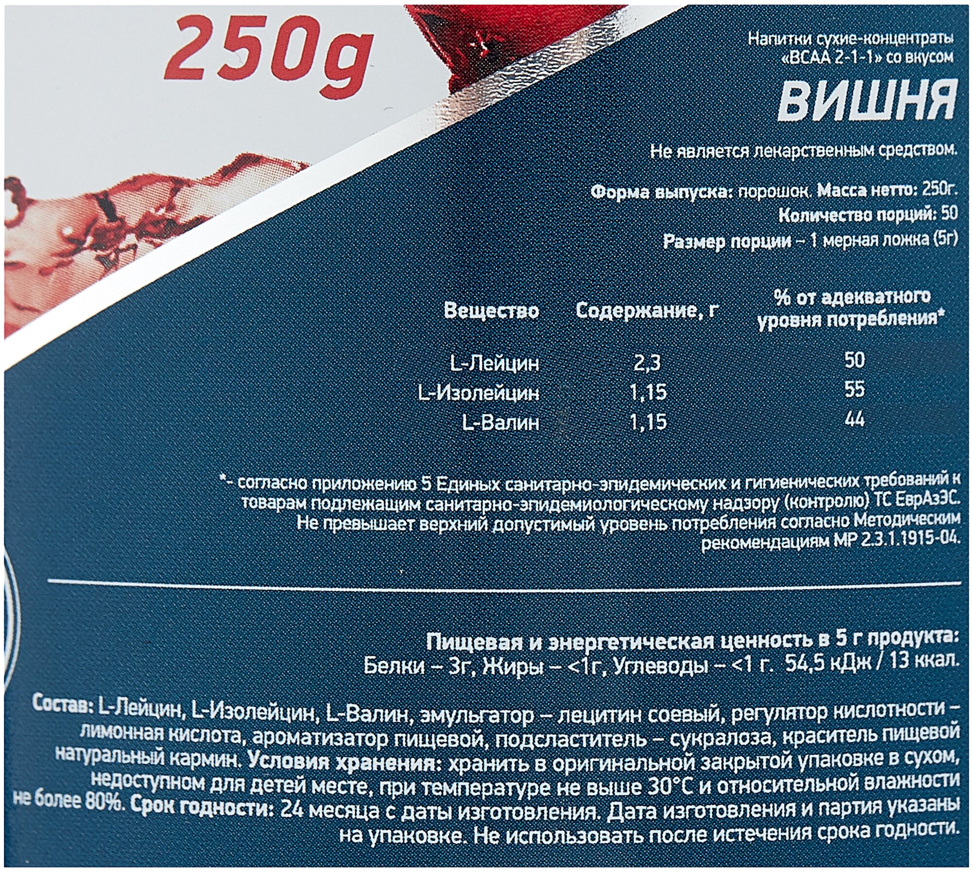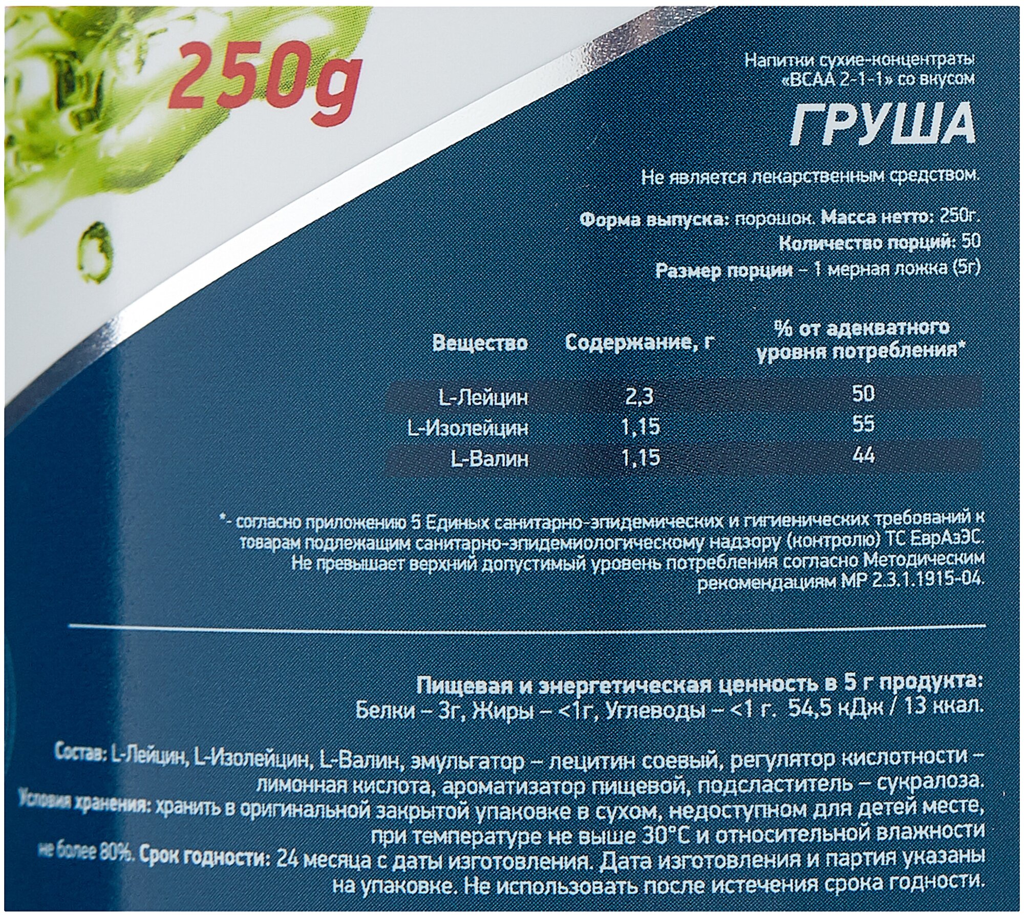 Type: BCAA, form: powder, main ingredient: valine, isoleucine, leucine, dietary features: no aspartame, no gluten, no lactose, no maltodextrin