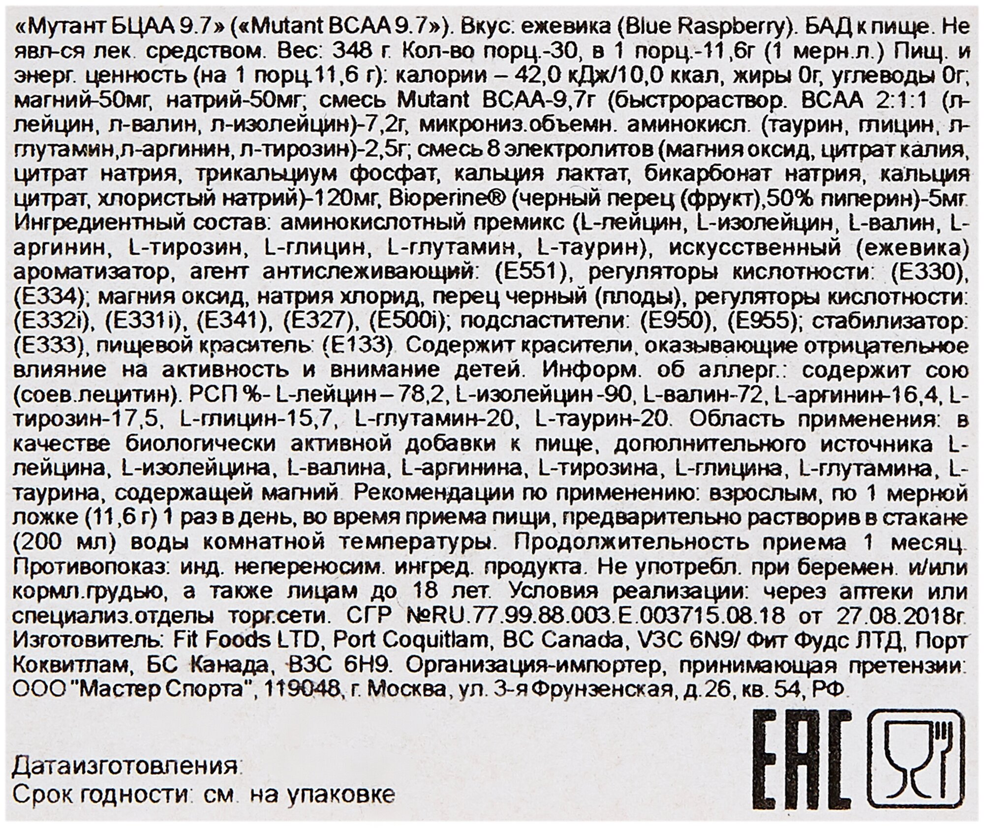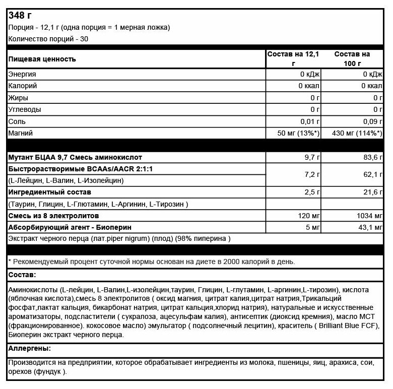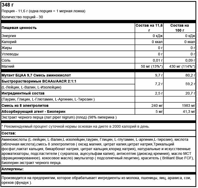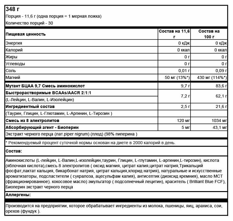 Type: BCAA, amino acid, formulation: powder, main ingredient: L-valine, L-isoleucine, L-leucine, valine, isoleucine, leucine
