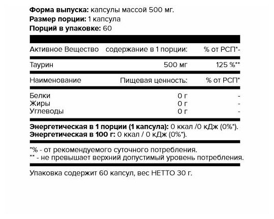 Type: amino acid, dosage form: capsules/tablets, main ingredient: taurine, dietary features: no aspartame