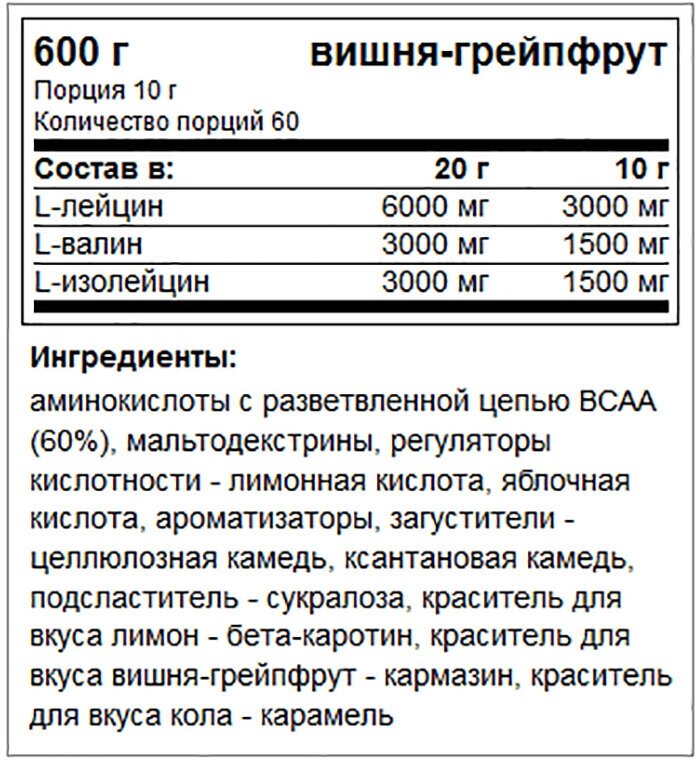 Type: amino acid complex, formulation: powder, main ingredient: valine, isoleucine, leucine, dietary features: no aspartame, no maltodextrin