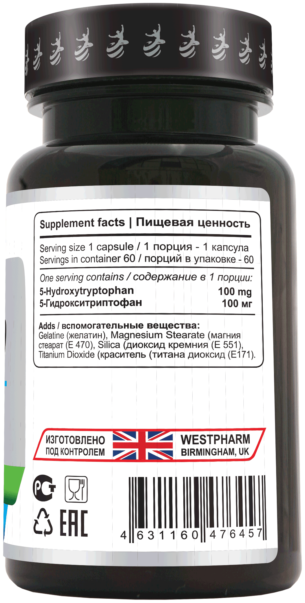 5-hydroxytryptophan, gelatin, magnesium stearate E470, silicon dioxide E551, titanium dioxide dye E171.