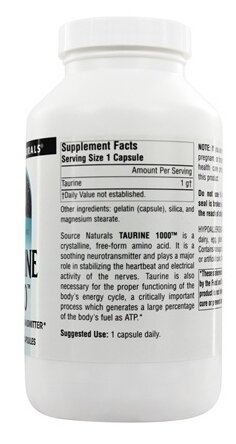 Type: amino acid, dosage form: capsules/tablets, main ingredient: taurine, dietary specifics: aspartame free, gluten free, maltodextrin free, sucralose free, vegetarian