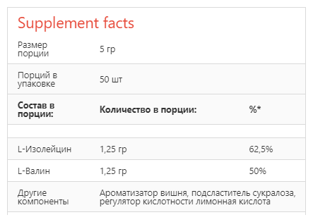 Type: BCAA, form: powder, main ingredient: valine, isoleucine, leucine, dietary features: no aspartame, no gluten, no lactose, no maltodextrin