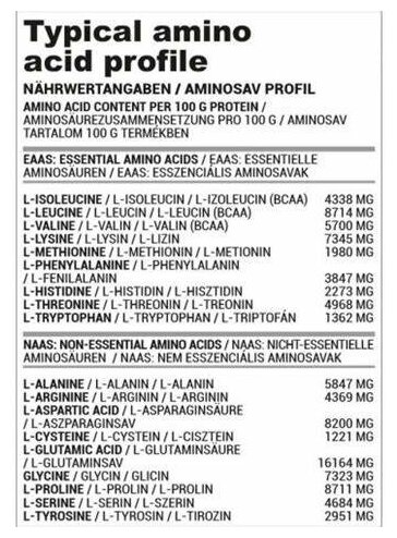 Type: amino acid complex, dosage form: capsules/tablets, main ingredient: aspartic acid, glutamic acid, leucine, dietary features: no aspartame, no maltodextrin, no sucralose