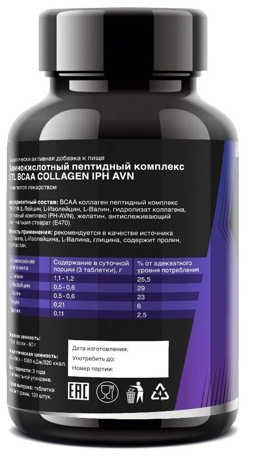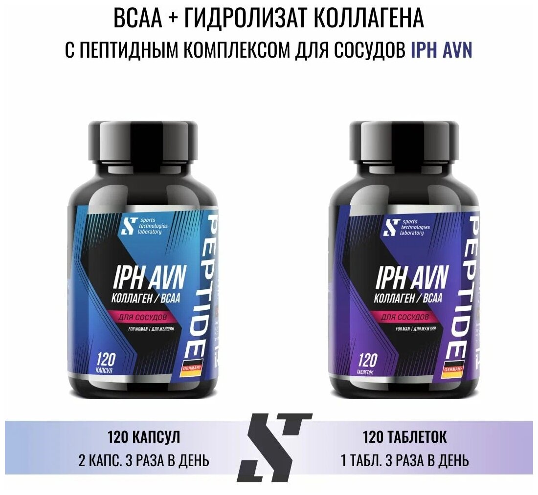 Amino acid peptide complex Sport's Technologies Laboratory IPH AVN BCAA Collagen for vessels, 120 caps