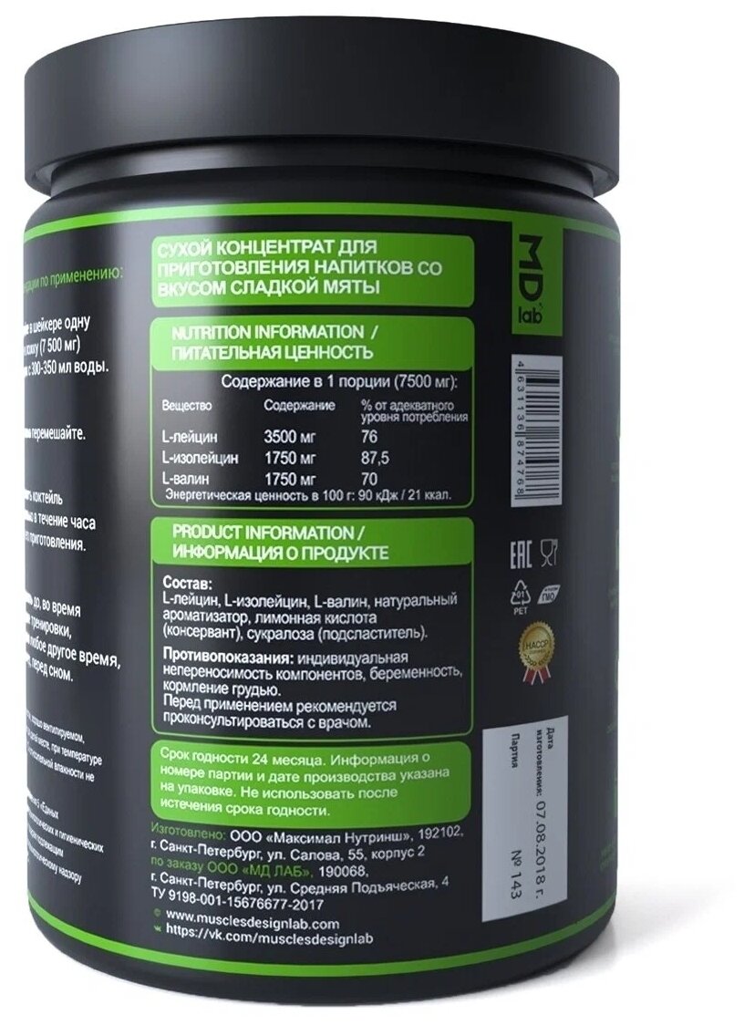 Type: BCAA, amino acid, amino acid complex, formulation: powder, main ingredient: L-leucine, valine, isoleucine, leucine, dietary features: no aspartame, no gluten, no lactose, no maltodextrin