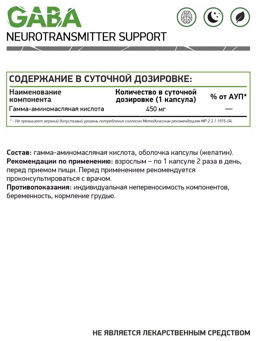 Type: amino acid, dosage form: capsules/tablets, main ingredient: GABA, dietary specifics: no aspartame, no gluten, no lactose, no maltodextrin, no sucralose