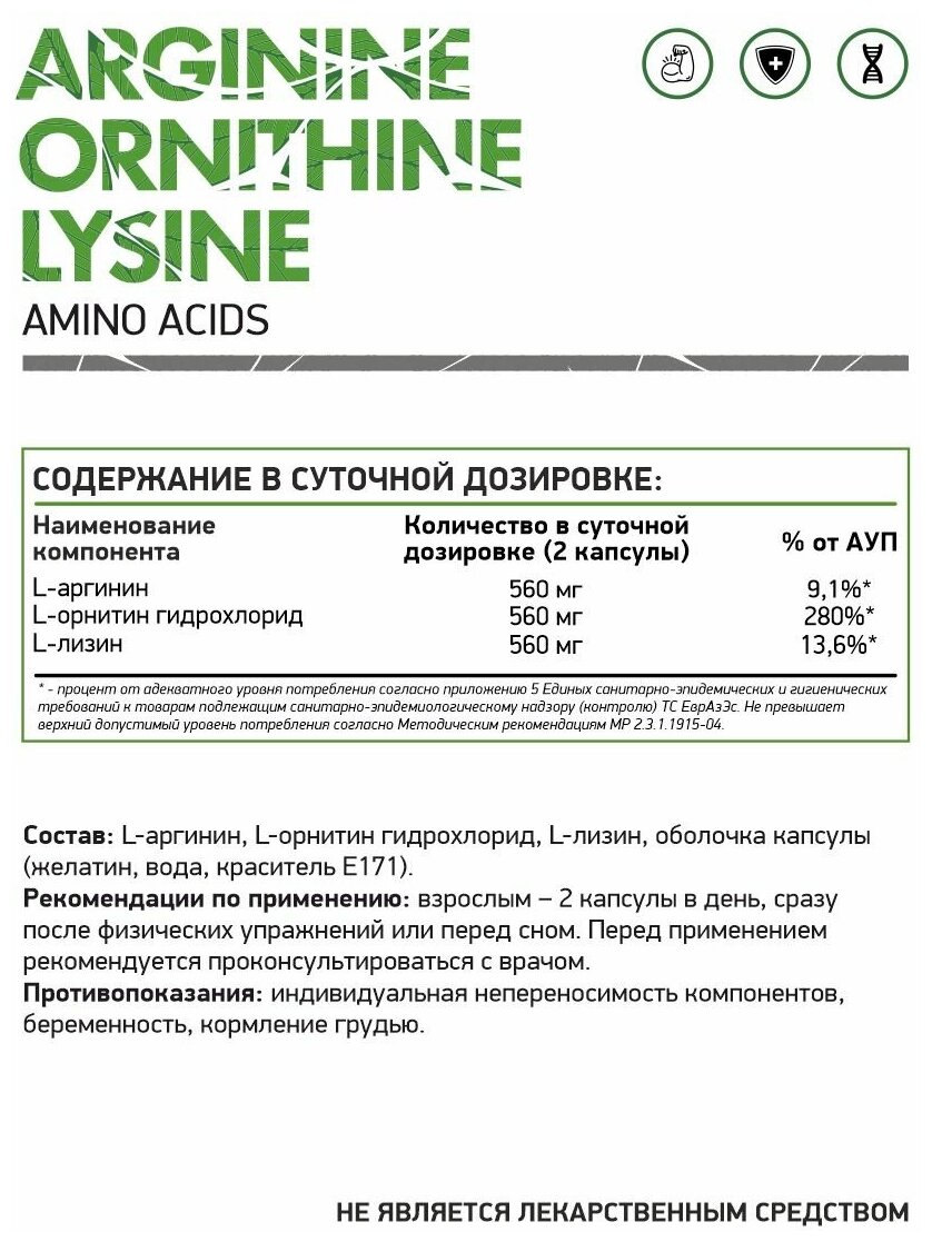 Type: amino acid, amino acid complex, formulation: capsules/tablets, main ingredient: arginine, lysine, ornithine, dietary features: aspartame free, gluten free, lactose free, maltodextrin free, sucra free