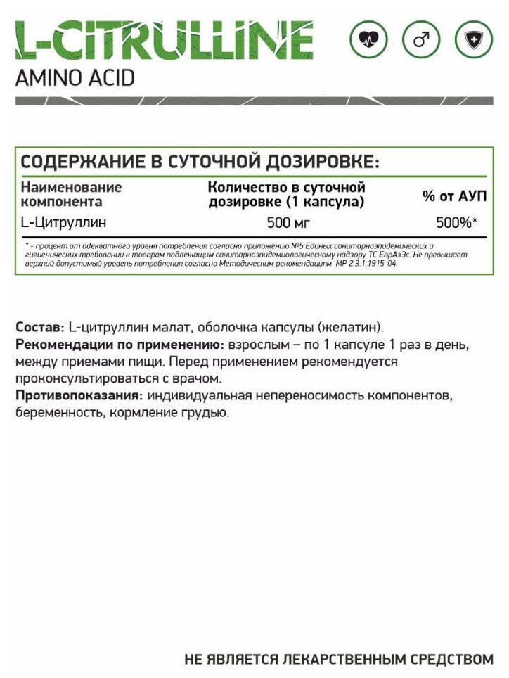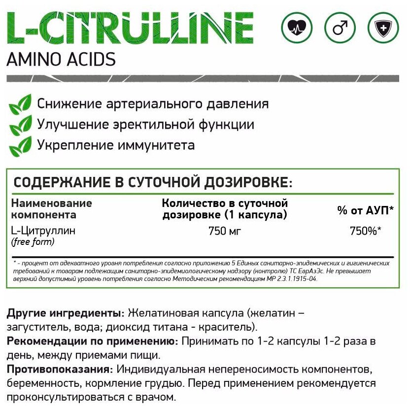 Type: amino acid, dosage form: capsules/tablets, main ingredient: citrulline, dietary features: no aspartame, no maltodextrin, no sucralose
