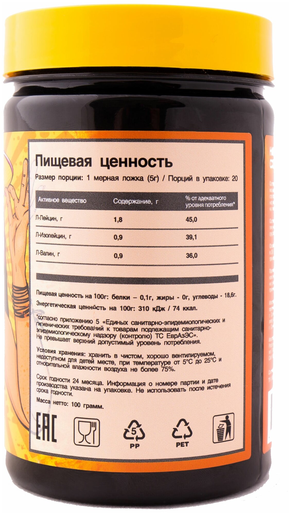 Type: BCAA, form: powder, main ingredient: valine, isoleucine, leucine, dietary features: no aspartame, no gluten, no lactose, no maltodextrin
