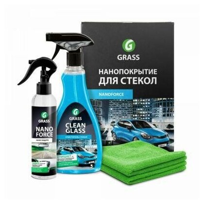 Included: glass cleaner Clean Glass 0.5 kg, NanoForce nanocoating 250 ml, napkins for applying nano means 100 pcs., microfiber for cleaning and polishing 2 pcs., instruction and training DVD