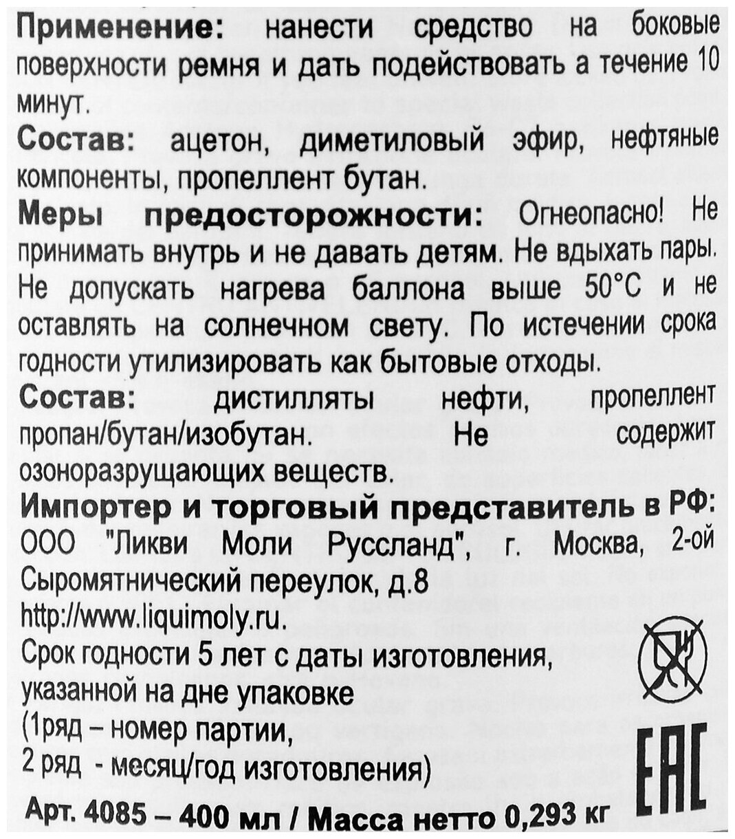 To eliminate slippage and squeaking of drive V-belts and multi-V-ribbed belts for driving units. To extend the life of belts and pulleys. Increases the efficiency of the belt drive.