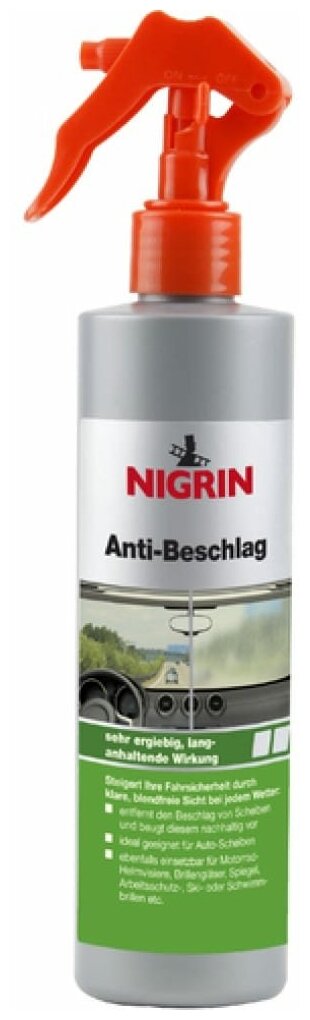 Clean glass surface, spray NIGRIN anti-fog on NIGRIN microfiber cloth, wipe glass surfaces, polish with dry NIGRIN microfiber cloth; repeat application every 4-6 weeks