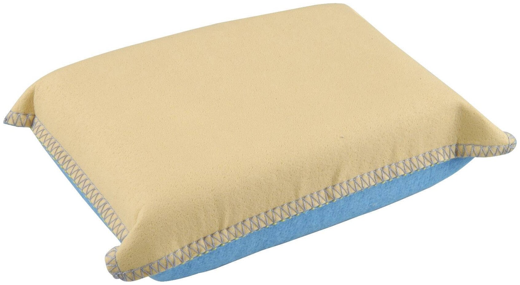 One side coated with artificial suede for wiping dirt, the other side is blue impregnated with an anti-fogging agent; size 12 x 8 x 4 cm