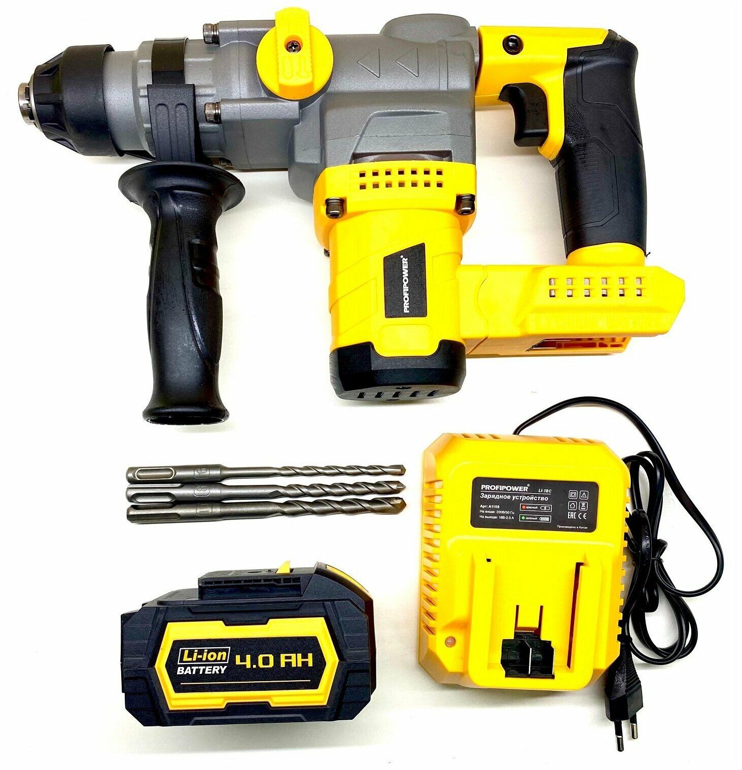 Cordless hammer drill; Li-ion battery 4.0Ah; Charger; Additional handle; Drill 6 mm; Drill 8 mm; Drill 10 mm; Manual; Case.