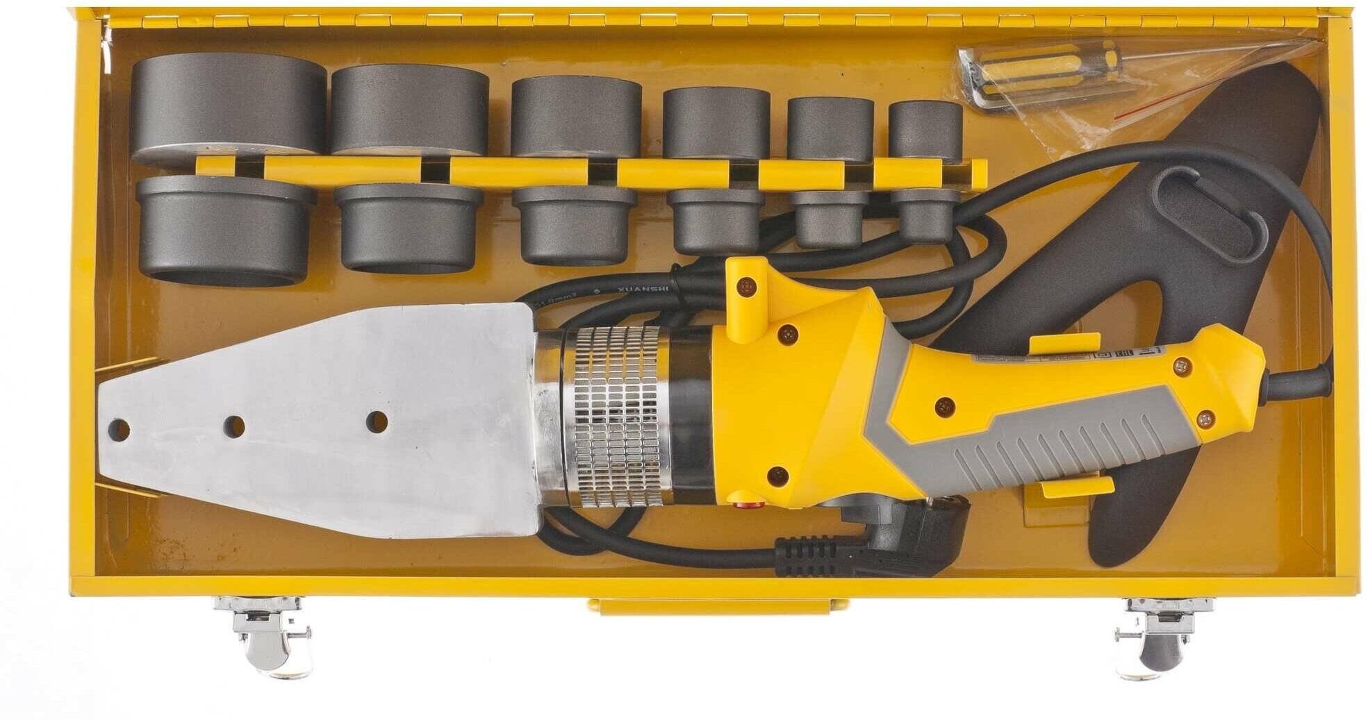 Equipment: welding machine, tripod, attachments for the welding machine with diameters of 20-63 mm, metal case, wrench for attachments