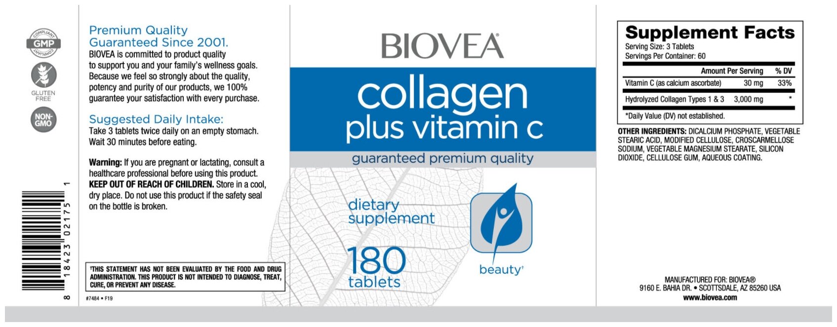 Collagen with vitamin C/Biovea, Collagen Plus Vitamin C, 180 tablets/ For ligaments and joints, skin, hair, nails