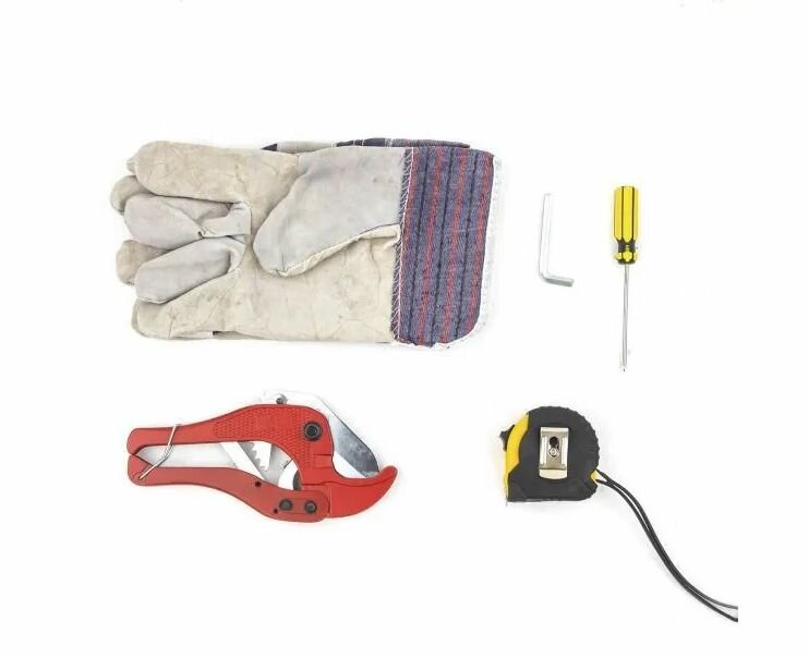 Tape measure, gloves, screwdriver, pipe cutter