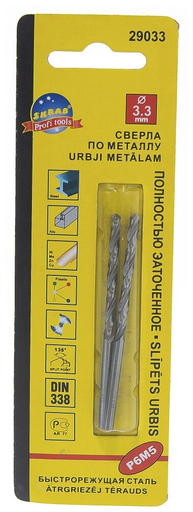 Standard dimensions: 3.3 mm, shank type: cylindrical, quantity in set package: 2 pcs., drill material: HSS, sharpening angle: 135 degrees, for metal
