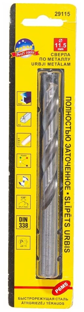 Complete set: piece, standard dimensions: 11.5 mm, shank type: cylindrical, quantity in set package: 1 pc., drill material: HSS, sharpening angle: 135 degrees, for metal