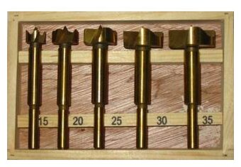 Standard sizes: forstner for wood 15, 20, 25, 30, 35 mm, shank type: cylindrical, quantity per set per package: 5 pcs., drill material: HSS-G TiN, for wood