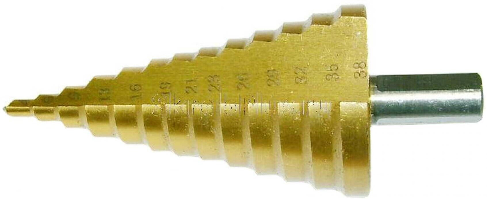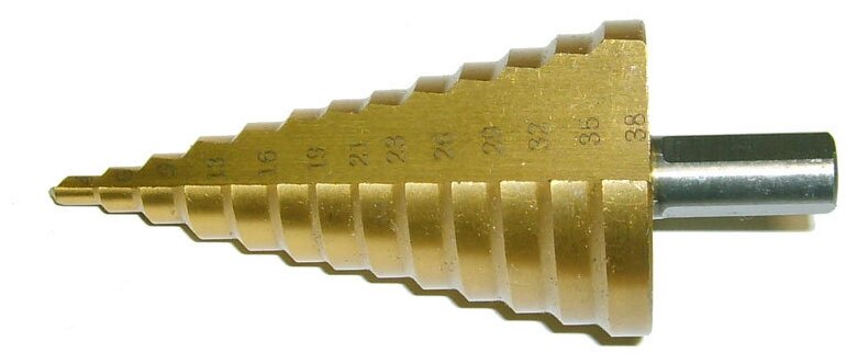 Equipment: piece, standard sizes: 13 steps 4-38 mm, shank type: hexagonal, quantity in a set package: 1 pc., drill material: HSS, for metal