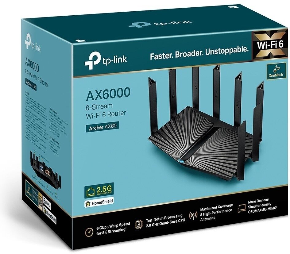 TP-LINK Archer AX80 router, supports WPA/WPA2/WPA3, VLAN, VPN, 2.4/5 GHz, 8 external antennas, 2500 Mbps