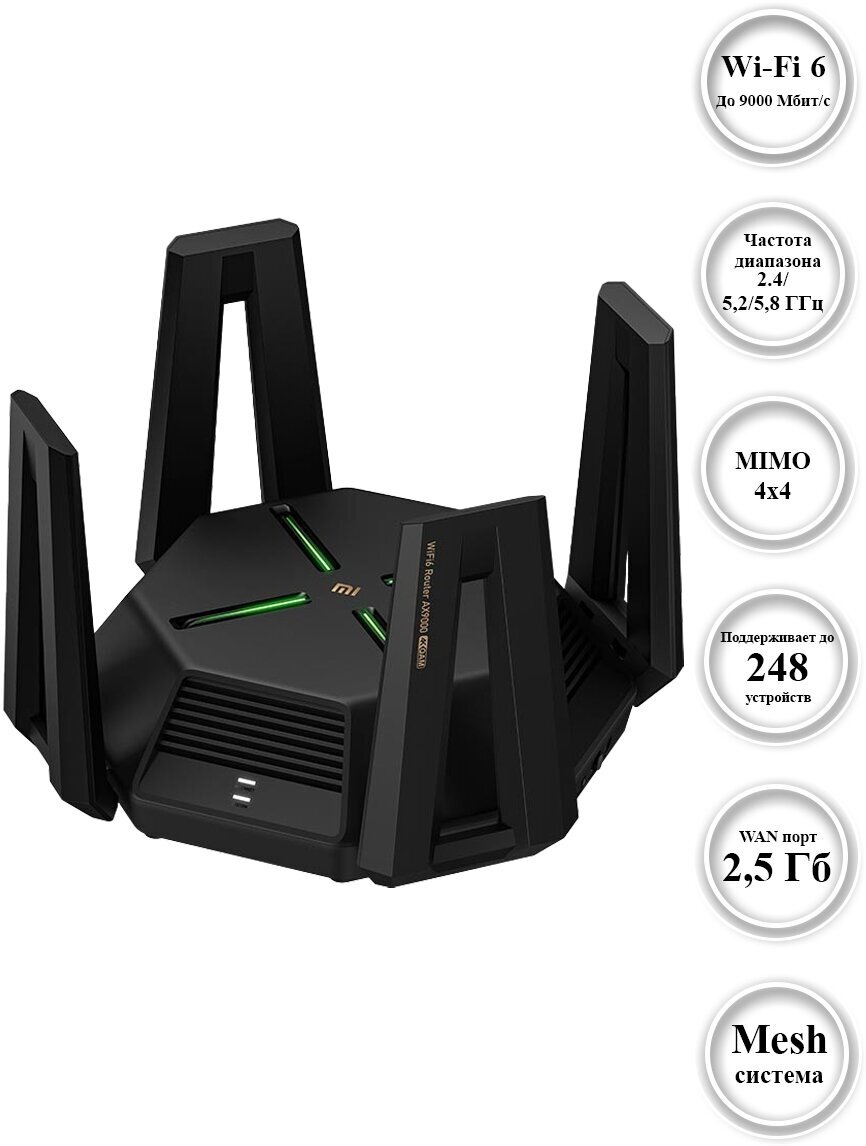 Device type: router, Frequency range of Wi-Fi devices: 2.4 / 5 GHz simultaneous operation, Internet connection WAN: Ethernet RJ-45, port speed: 1 Gbit/s, 2.5 Gbit/s, 4804 Mbit/s, Wi-Fi standard Fi 802.11: a Wi-Fi 2, ac Wi-Fi 5, ax Wi-Fi 6, b Wi-Fi 1, g